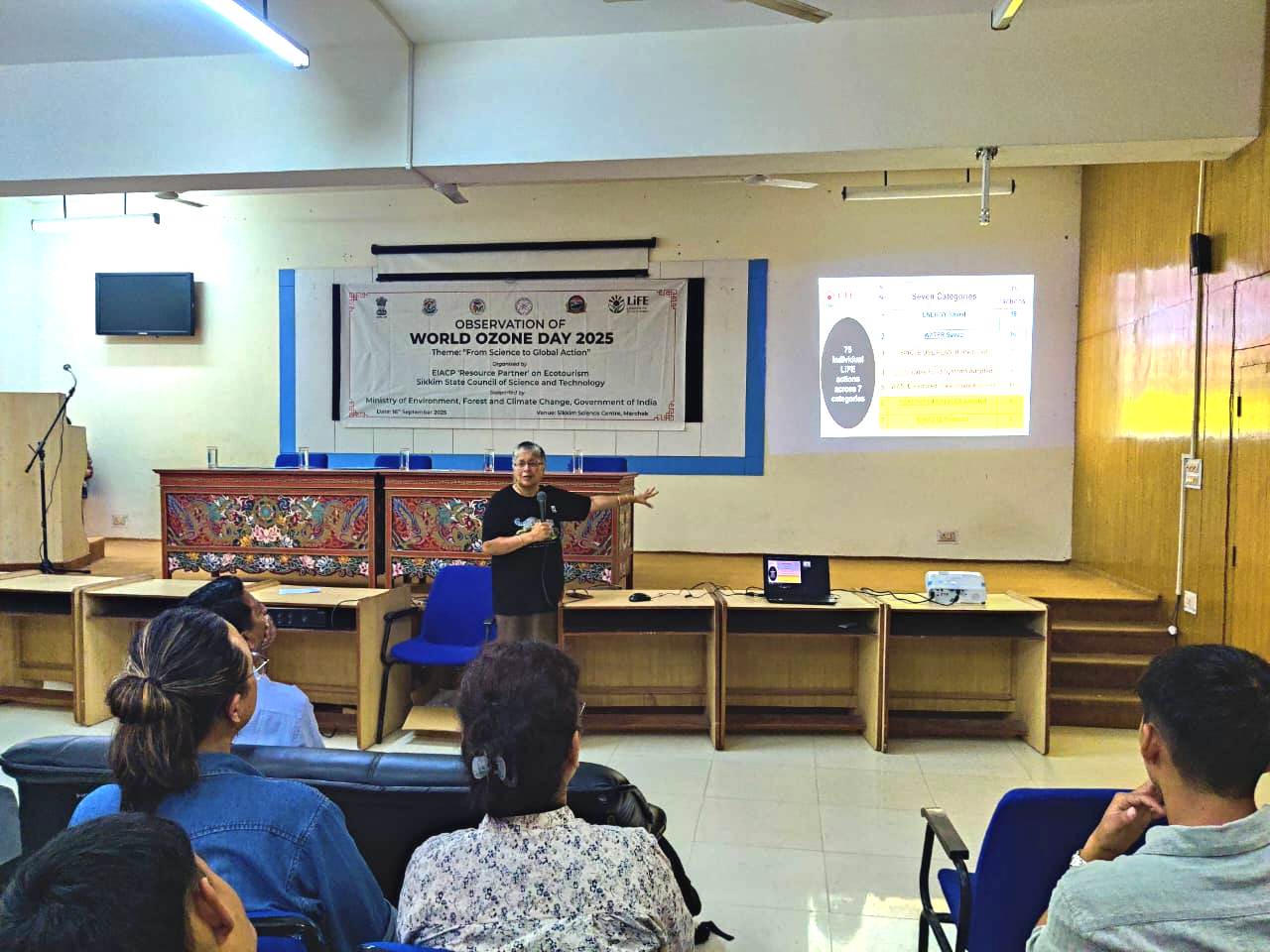 Environmental Information, Awareness, Capacity Building and Livelihood Programme (EIACP) Resource Partner on Ecotourism under Sikkim State Council of Science and Technology observed World Ozone Day 2025 at Sikkim Science Centre, Marchak, on 16th September 2025. The theme for this year’s World Ozone Day was “From Science to Global Action”. It highlights how scientific research on ozone depletion led to international cooperation and effective policies that are now helping to heal the ozone layer. More than 100 students from Biraspati Parsai Govt. Senior Secondary School, Baha’i Senior Secondary School, Saramsa and local public actively participated in the programme.